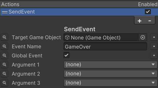 The event system in State Designer lets your state machine react to runtime changes without hard references between every state/action/condition. You can trigger events from graph actions, from code, or by starting event-node branches directly. Events can be sent with the Send Event action. This action uses an event name with up to 3 arguments.